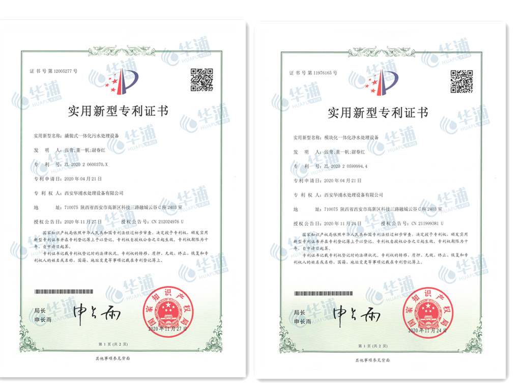 近日,華浦水科技自主研發的“撬裝式一體化凈水處理設備”和“模塊化一體化污水處理設備”兩項裝置獲得了國家知識產權實用新型專利。