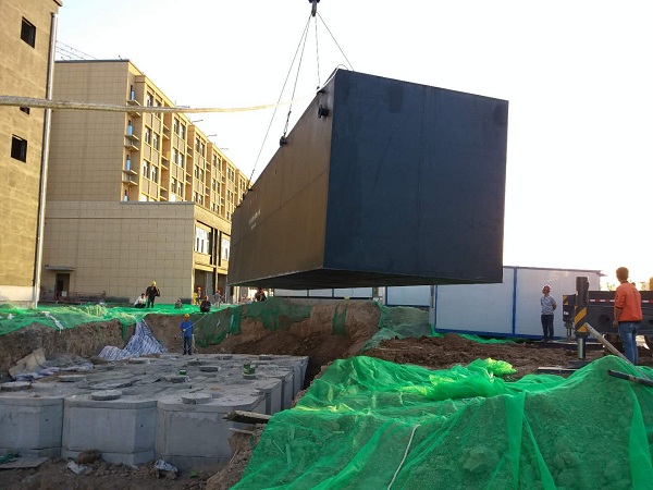 2、安裝:根據(jù)安裝圖就位,各箱體依次就位,箱體的位置、方向不能放錯(cuò),互相間距必須準(zhǔn)確,并連接好管道。在設(shè)備內(nèi)注入清水,檢查各管道有無(wú)滲漏,若無(wú)則箱體四周覆土,直至設(shè)備檢查孔,并平整地面。把電控箱控制線(xiàn)與水
